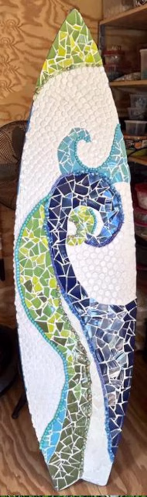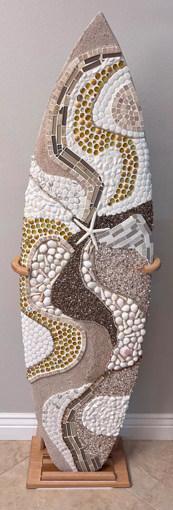 I have been an artist my entire life. I have a BFA from CW Post LIU in NY. I have worked as a graphic designer, web designer, owned a faux painting business, and taught digital design for 11 years. Now retired, I do mosaics on old surfboards.My most recent projects have been resurfacing surfboards and creating unique original designs, featuring local materials, such as beach glass, sand, colored shells, and many more. My surfboards are one of a kind, coastal designs.